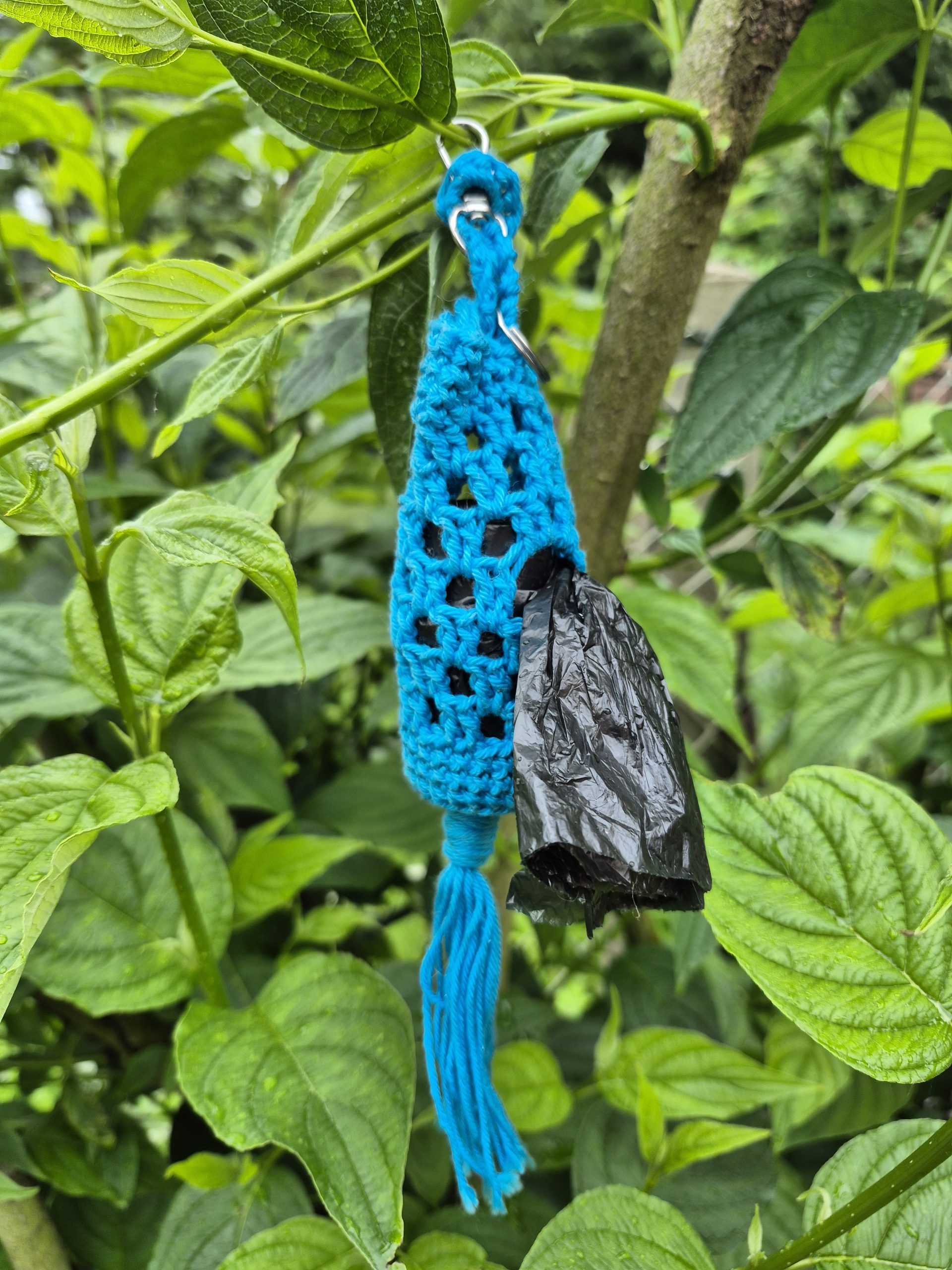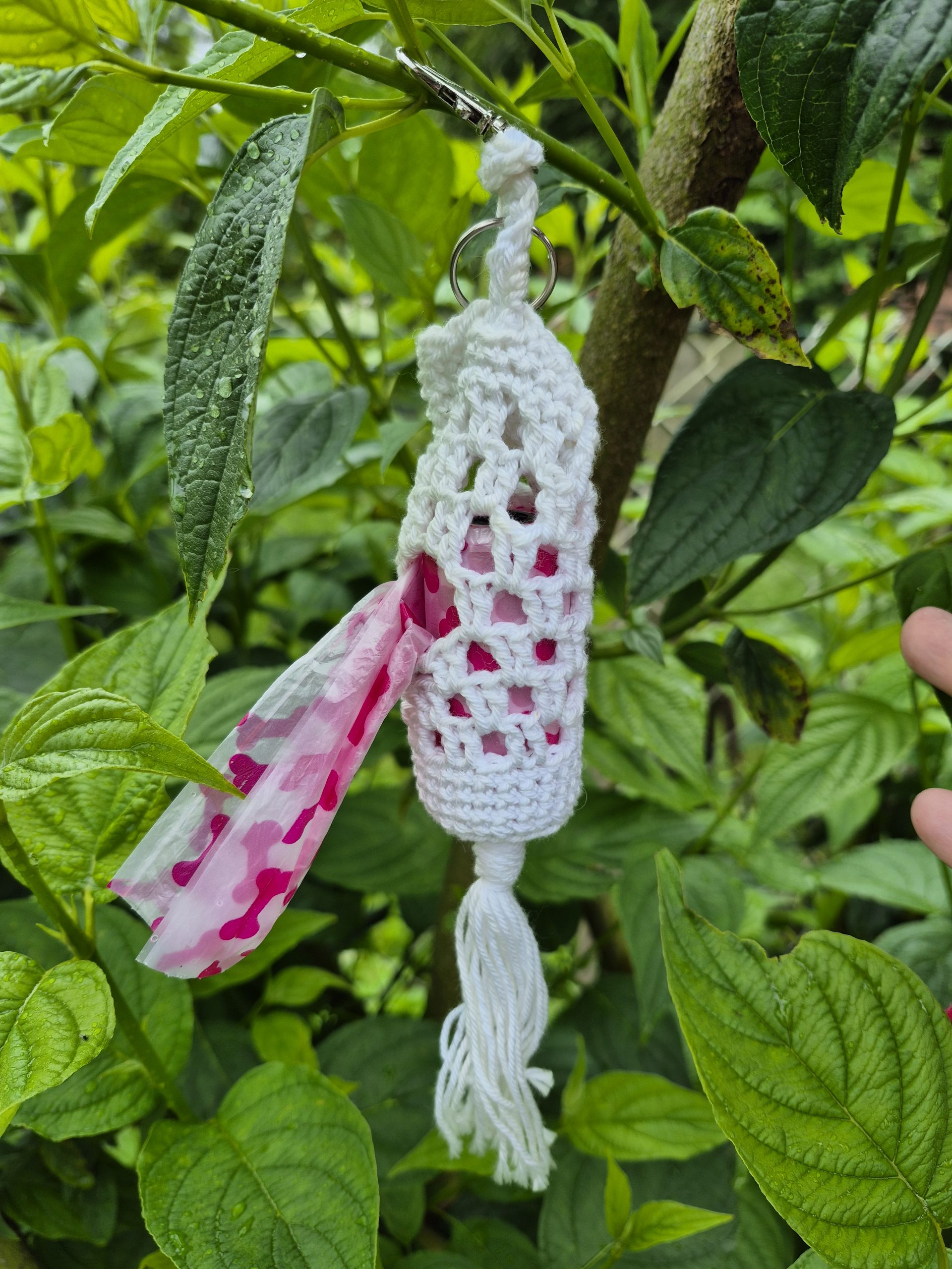 Der Beutelspender wird aus strapazierfähigem Garn gehäkelt und ist angenehm leicht. Durch die seitliche Öffnung kannst du problemlos einzelne Beutel herausziehen. Innen passt eine handelsübliche Rolle Kotbeutel hinein – der Spender ist natürlich wiederbefüllbar.