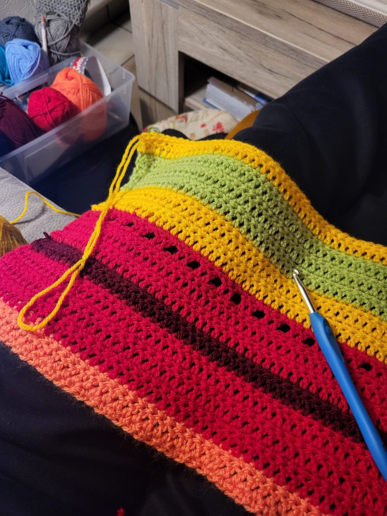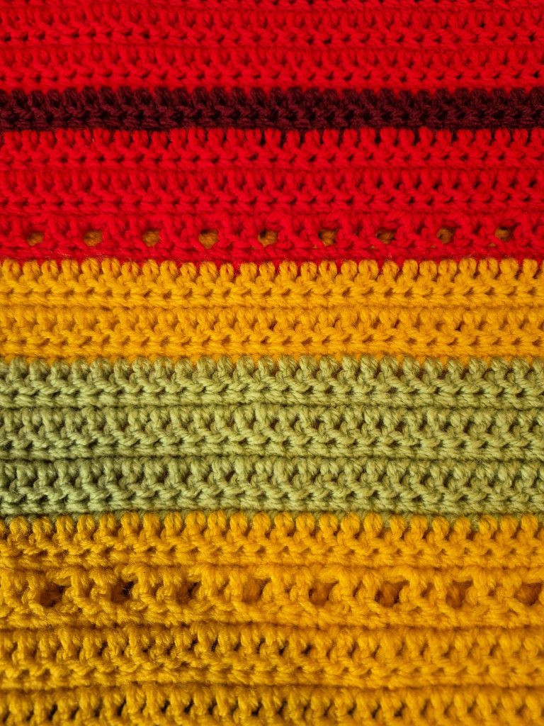 Wenn dir eine große Decke zu umfangreich erscheint, kannst du das Konzept ganz einfach verkleinern. Statt einer Decke eignet sich zum Beispiel ein Schal hervorragend – egal ob als luftiges Sommertuch, klassischer Winterschal oder moderner Loop-Schal. Du häkelst dabei weiterhin regelmäßig, arbeitest mit Farbwechseln und Wiederholungen, hast aber schneller sichtbare Erfolge und kein riesiges Projekt auf dem Sofa liegen.
