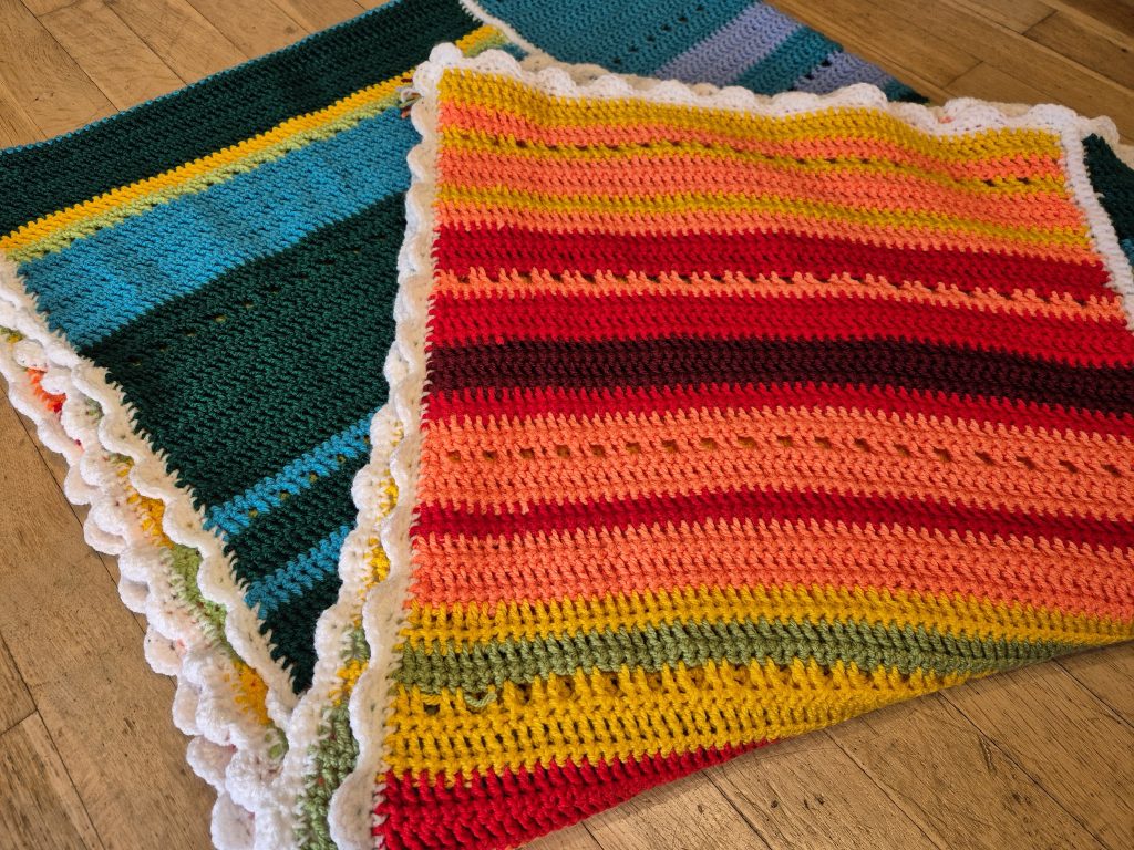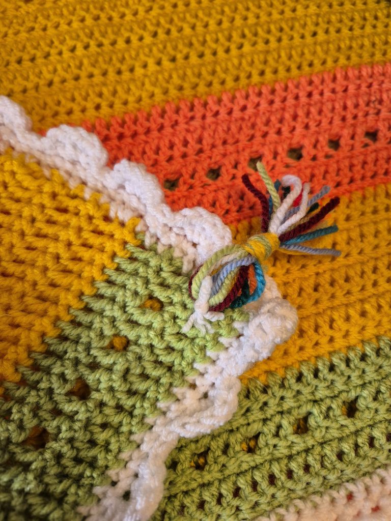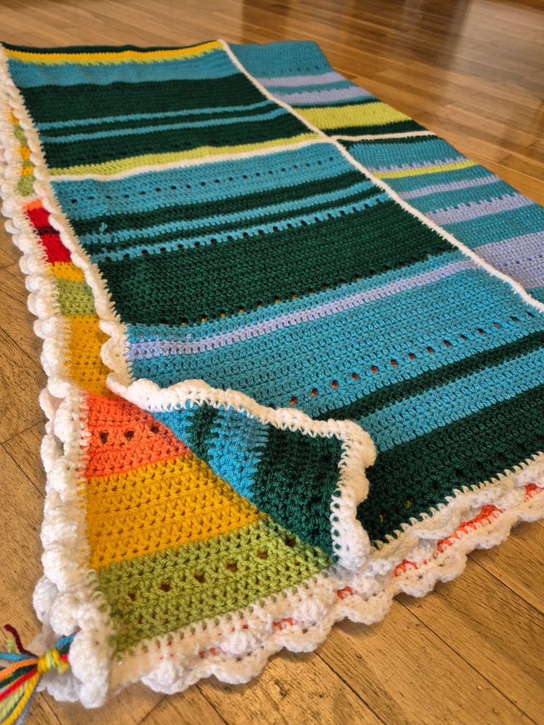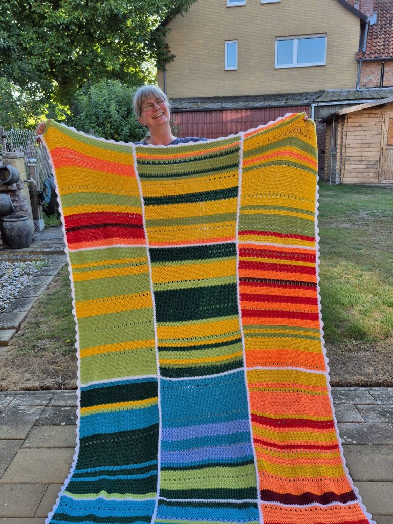 - Um komplette Decke habe ich einen Wellenrand gehäkelt.