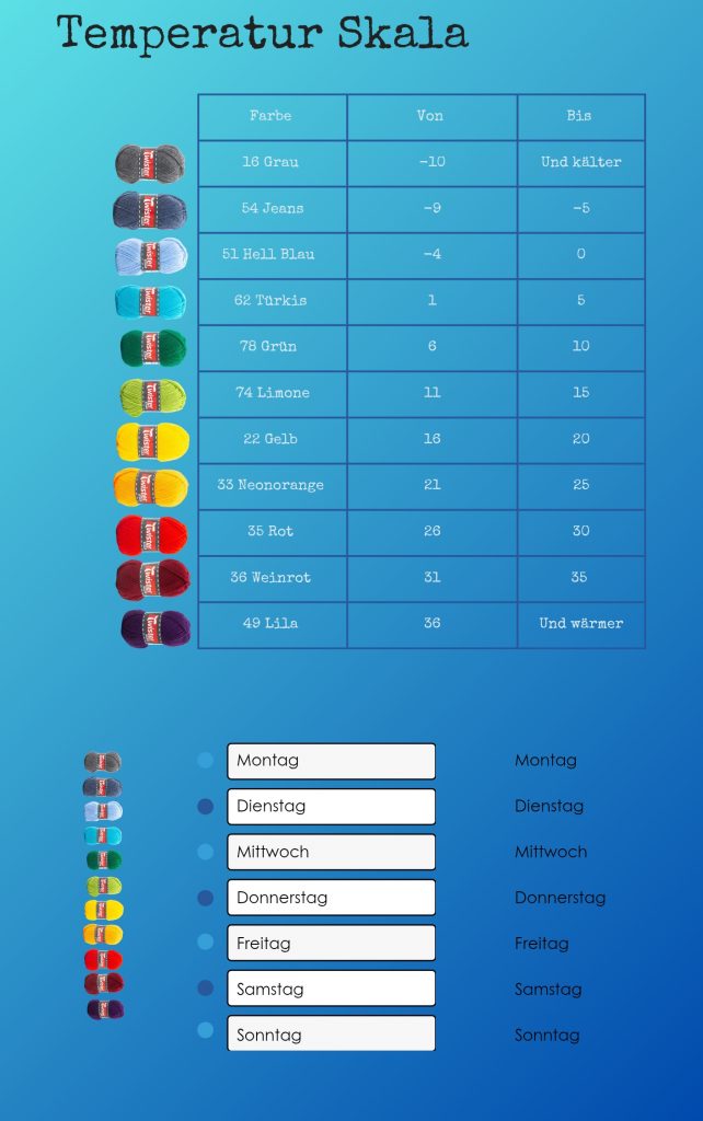 Die exakte Garnmenge lässt sich bei einer Temperaturdecke nicht vorhersagen. Niemand weiß im Voraus, wie oft welche Temperatur vorkommt. Genau deshalb sind fertig zusammengestellte Wollpakete zwar bequem, aber nicht immer ideal – vor allem dann nicht, wenn man Häkeln lernen und flexibel bleiben möchte.